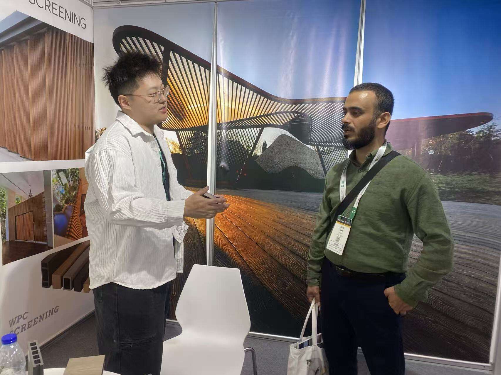 Au salon, Nanjing Jufeng New Material Co., Ltd. s'est concentrée sur la présentation d'une série de produits en plastique bois tels que les sols extérieurs, les garde-corps paysagers et les passerelles anti-corrosion. S'appuyant sur des avantages clés tels qu'une haute résistance, une excellente tenue aux intempéries, l'absence totale de formaldéhyde et la recyclabilité, ces produits ont remporté une reconnaissance élevée auprès des acheteurs et des designers du Moyen-Orient et du monde entier. L'équipe commerciale de l'entreprise, grâce à des explications techniques approfondies, une communication efficace et une riche expérience sectorielle, a parfaitement cerné les besoins des clients, promu activement la valeur de la marque, conclu plusieurs intentions de coopération sur place, atteint avec succès les objectifs de participation au salon et s'est imposée comme une attraction majeure de l'événement.